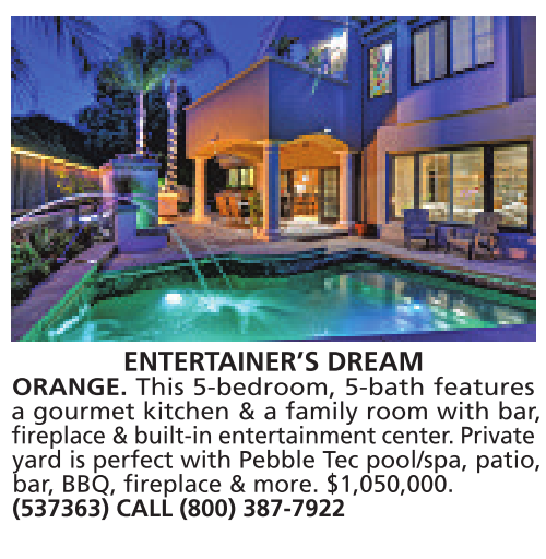 ENTERTAINER’S DREAM ORANGE. This 5-bedroom, 5-bath features a gourmet kitchen & a family room with bar, fireplace &built-in entertainment center.Private yard is perfect with Pebble Tec pool/spa, patio, bar, BBQ, fireplace & more. $1,050,000. (537363) CALL (800) 387-7922
