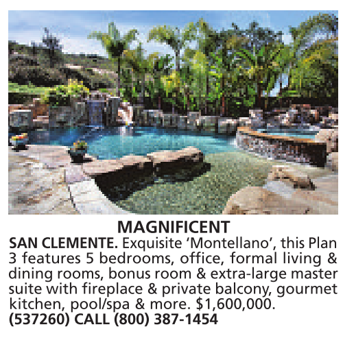 MAGNIFICENT SAN CLEMENTE. Exquisite ‘Montellano’, this Plan 3 features 5 bedrooms, office, formal living & dining rooms, bonus room &extra-large master suitewith fireplace &private balcony,gourmet kitchen, pool/spa & more. $1,600,000. (537260) CALL (800) 387-1454