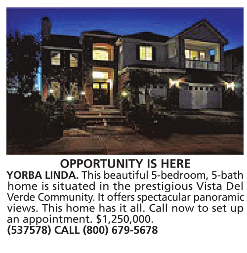 OPPORTUNITY IS HERE YORBA LINDA. This beautiful 5-bedroom, 5-bath home is situated in the prestigious Vista Del Verde Community.Itoffers spectacular panoramic views. This home has it all. Call now to set up an appointment. $1,250,000. (537578) CALL (800) 679-5678