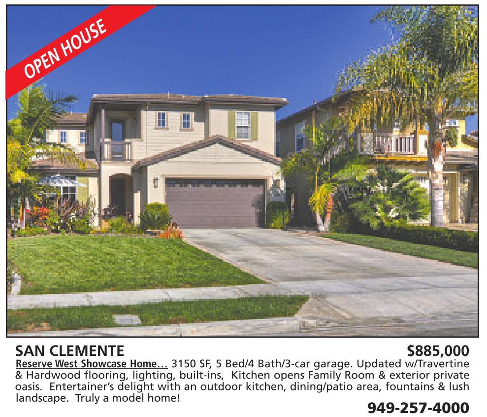 SAN CLEMENTE $885,000 Reserve West Showcase Home… 3150 SF, 5 Bed/4 Bath/3-car garage. Updated w/Travertine & Hardwood flooring, lighting, built-ins, Kitchen opens Family Room & exterior private oasis. Entertainer’s delight with an outdoor kitchen, dining/patio area, fountains & lush landscape. Truly a model home! 949-257-4000