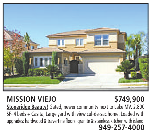 MISSION VIEJO $749,900 Stoneridge Beauty! Gated, newer community next toLake MV. 2,800 SF-4beds+Casita, Large yard with view cul-de-sac home.Loaded with upgrades:hardwood &travertinefloors,granite &stainless kitchen with island.