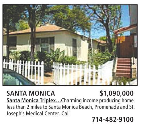 SANTA MONICA $1,090,000 SantaMonicaTriplex…Charmingincome producinghome less than 2miles to SantaMonicaBeach, Promenadeand St. Joseph’s Medical Center.Call 714-482-9100