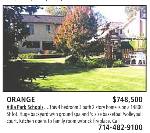 ORANGE $748,500 VillaPark Schools….This 4bedroom3bath2story homeisona14800 SF lot. Hugebackyard w/in ground spaand ½size basketball/volleyball court. Kitchen opens to family room w/brick fireplace.Call 714-482-9100