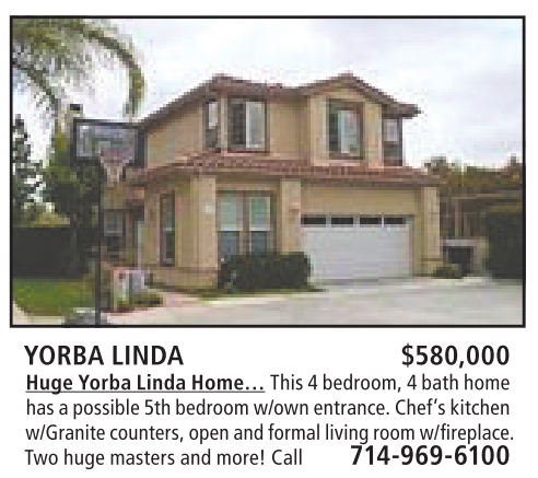 YORBA LINDA $580,000 Huge YorbaLinda Home… This 4bedroom,4bathhome hasapossible 5thbedroom w/ownentrance.Chef’s kitchen w/Granitecounters,openand formal living room w/fireplace.