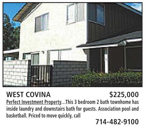 WEST COVINA $225,000 Perfect Investment Property…This 3bedroom 2bath townhome has inside laundry and downstairs bath for guests. Association pool and basketball. Priced to move quickly, call 714-482-9100