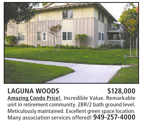 LAGUNA WOODS $128,000 AmazingCondoPrice!. IncredibleValue. Remarkable unit in retirementcommunity.2BR/2 bath groundlevel. Meticulously maintained. Excellentgreen spacelocation. Manyassociationservicesoffered! 949-257-4000