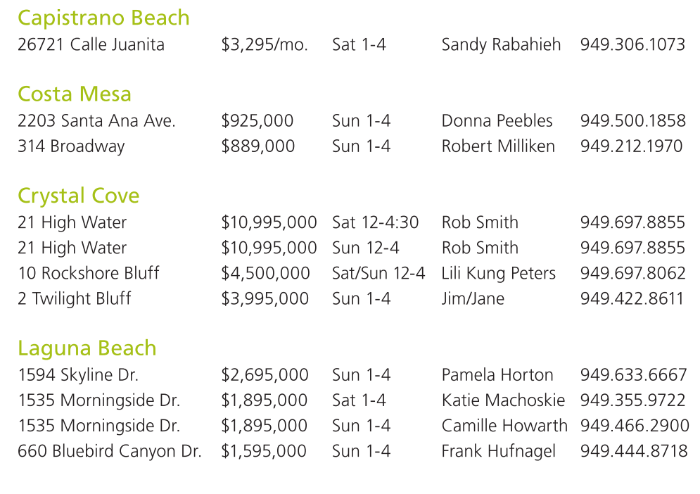 Costa Mesa 2203 Santa Ana Ave. $925,000 Sun 1-4 Donna Peebles 949.500.1858 314 Broadway $889,000 Sun 1-4 Robert Milliken 949.212.1970 Crystal Cove 21 High Water $10,995,000 Sat 12-4:30 Rob Smith 949.697.8855 21 High Water $10,995,000 Sun 12-4 Rob Smith 949.697.8855 10 Rockshore Bluff $4,500,000 Sat/Sun 12-4 Lili Kung Peters 949.697.8062 2 Twilight Bluff $3,995,000 Sun 1-4 Jim/Jane 949.422.8611 Laguna Beach 1594 Skyline Dr. $2,695,000 Sun 1-4 Pamela Horton 949.633.6667 1535 Morningside Dr. $1,895,000 Sat 1-4 Katie Machoskie 949.355.9722 1535 Morningside Dr. $1,895,000 Sun 1-4 Camille Howarth 949.466.2900 660 Bluebird Canyon Dr. $1,595,000 Sun 1-4 Frank Hufnagel 949.444.8718