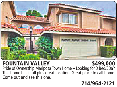 FOUNTAIN VALLEY $499,000 Pride of Ownership Mariposa Town Home –Looking for 3Bed/3Ba? This home has it all plus great location, Great place to call home. Come outand see this one.