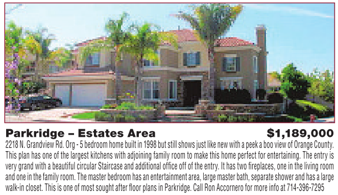Parkridge – Estates Area $1,189,000 2218 N. Grandview Rd. Org-5bedroomhomebuiltin1998but still showsjustlike newwithapeekaboo view of Orange County. This plan has one of the largest kitchens with adjoining family room tomake this home perfect for entertaining. The entry is very grand with abeautiful circular Staircase and additional office off ofthe entry. It has two fireplaces, one in the living room and oneinthe familyroom. Themaster bedroomhas an entertainmentarea,large master bath,separateshowerand hasalarge walk-incloset. This is oneofmost sought after floorplans in Parkridge.CallRon Accornerofor moreinfoat714-396-7295