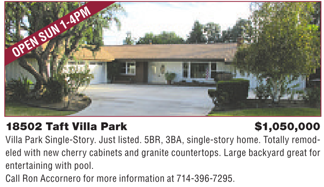 18502 Taft Villa Park $1,050,000 Villa Park Single-Story. Just listed. 5BR, 3BA, single-story home. Totally remodeled with new cherry cabinets and granite countertops. Large backyard great for entertaining with pool. Call Ron Accornero formoreinformation at 714-396-7295.