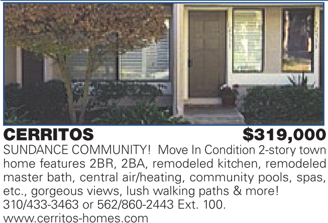 etc., gorgeous views, lush walking paths & more! 310/433-3463 or 562/860-2443 Ext. 100. www.cerritos-homes.com