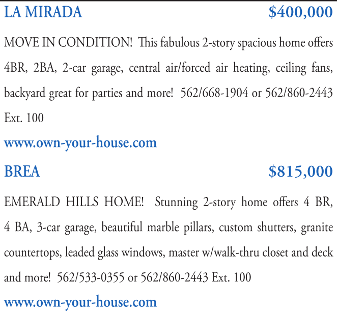 LA MIRADA $400,000 MOVE IN CONDITION! This fabulous 2-storyspacious home offers 4BR, 2BA, 2-car garage, central air/forced air heating, ceiling fans, backyard great for parties and more! 562/668-1904 or 562/860-2443 Ext. 100 www.own-your-house.com BREA $815,000 EMERALD HILLS HOME! Stunning 2-story home offers 4 BR, 4 BA, 3-car garage, beautiful marble pillars, custom shutters, granite countertops, leaded glass windows, master w/walk-thru closet and deck and more! 562/533-0355 or 562/860-2443 Ext. 100 www.own-your-house.com