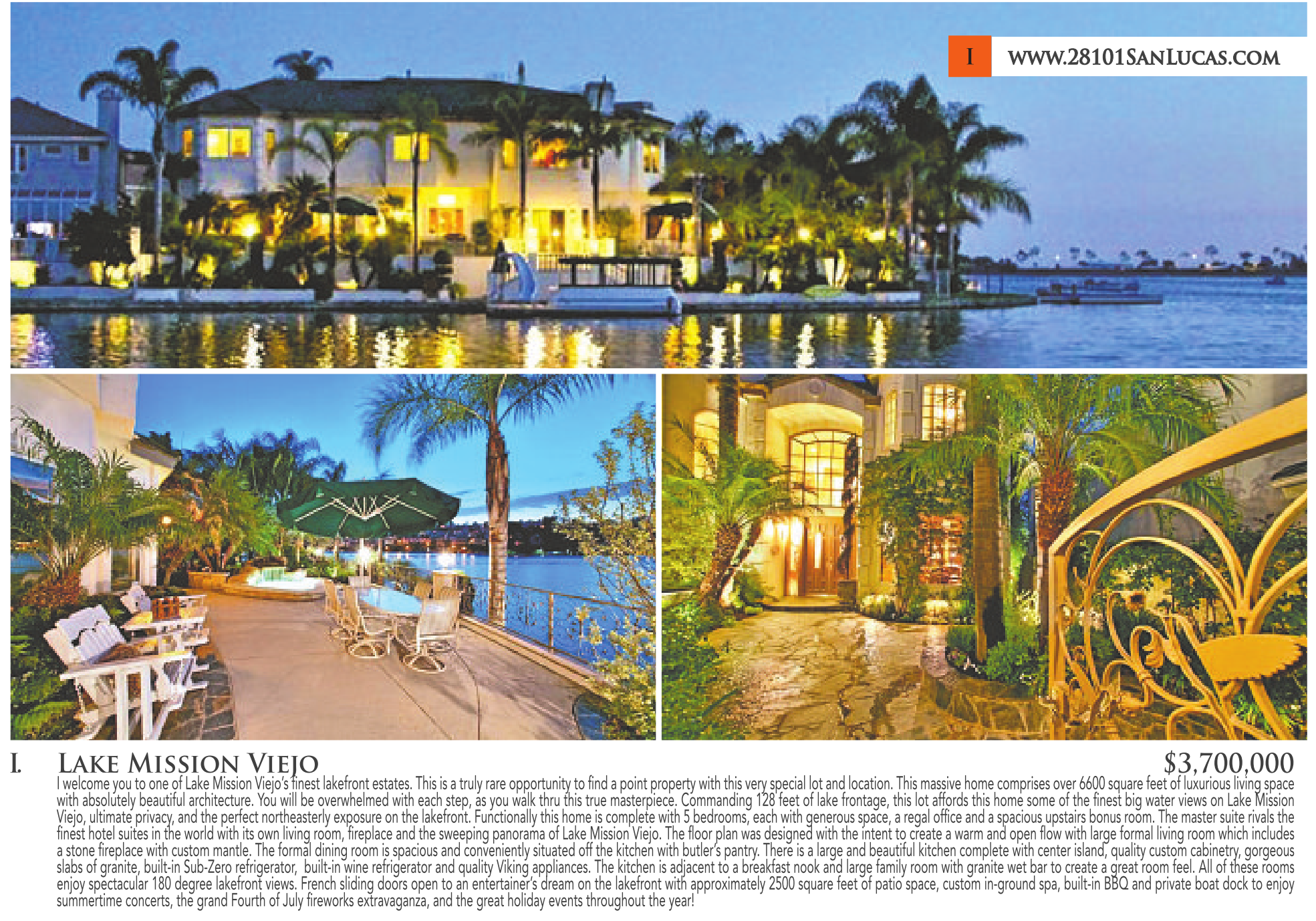 Iwelcome you to one of Lake Mission Viejo’s finest lakefront estates. This is atruly rare opportunity to find apoint property with this very special lot and location. This massive home comprises over 6600 square feet of luxurious living space with absolutely beautiful architecture. Youwill be overwhelmed with each step, as you walk thru this true masterpiece. Commanding 128 feet of lake frontage, this lot affords this home some of the finest big water views on Lake Mission Viejo, ultimate privacy, and the perfect northeasterly exposure onthe lakefront. Functionally this home is complete with 5bedrooms, each with generous space, aregal office and aspacious upstairs bonus room. The master suite rivals the finest hotel suites in the world with its own living room, fireplace and the sweeping panorama of Lake Mission Viejo. The floor plan was designed with the intent to create awarm and open flow with large formal living room which includes astone fireplace with custom mantle. The formal dining room is spacious and conveniently situated off the kitchen with butler’s pantry. There isalarge and beautiful kitchen complete with center island, quality custom cabinetry, gorgeous slabs of granite, built-in Sub-Zero refrigerator, built-in wine refrigerator and quality Viking appliances. The kitchen is adjacent to abreakfast nook and large family room with granite wet bar to create agreat room feel. All of these rooms enjoy spectacular 180 degree lakefront views. French sliding doors open to an entertainer’s dream on the lakefront with approximately 2500 square feet of patio space, custom in-ground spa, built-in BBQ and private boat dock to enjoy summertime concerts, the grand Fourth of July fireworks extravaganza, and the great holiday events throughout the year!