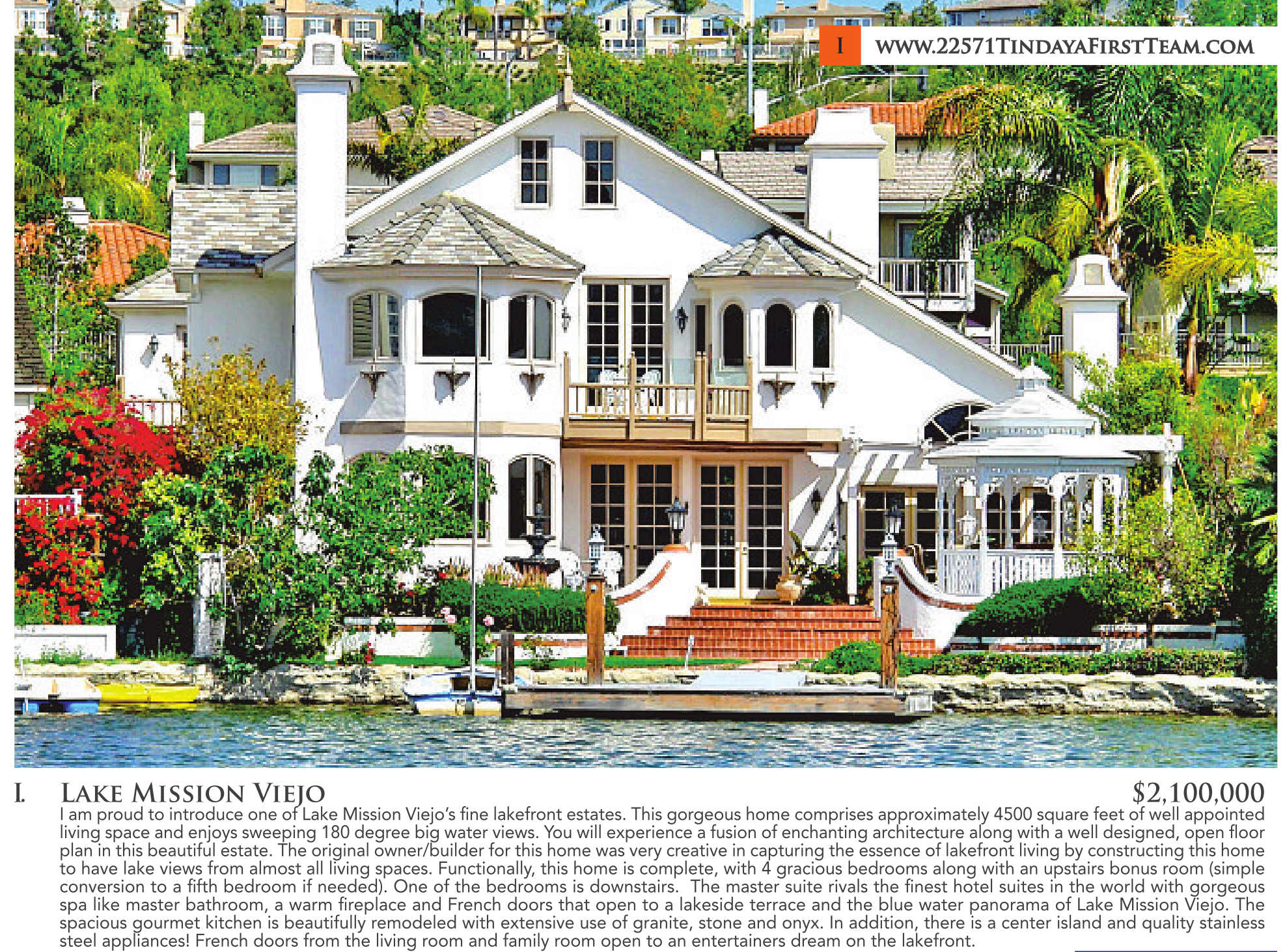 I am proud to introduce one of Lake Mission Viejo’s fine lakefront estates. This gorgeous home comprises approximately 4500 square feet of well appointed
