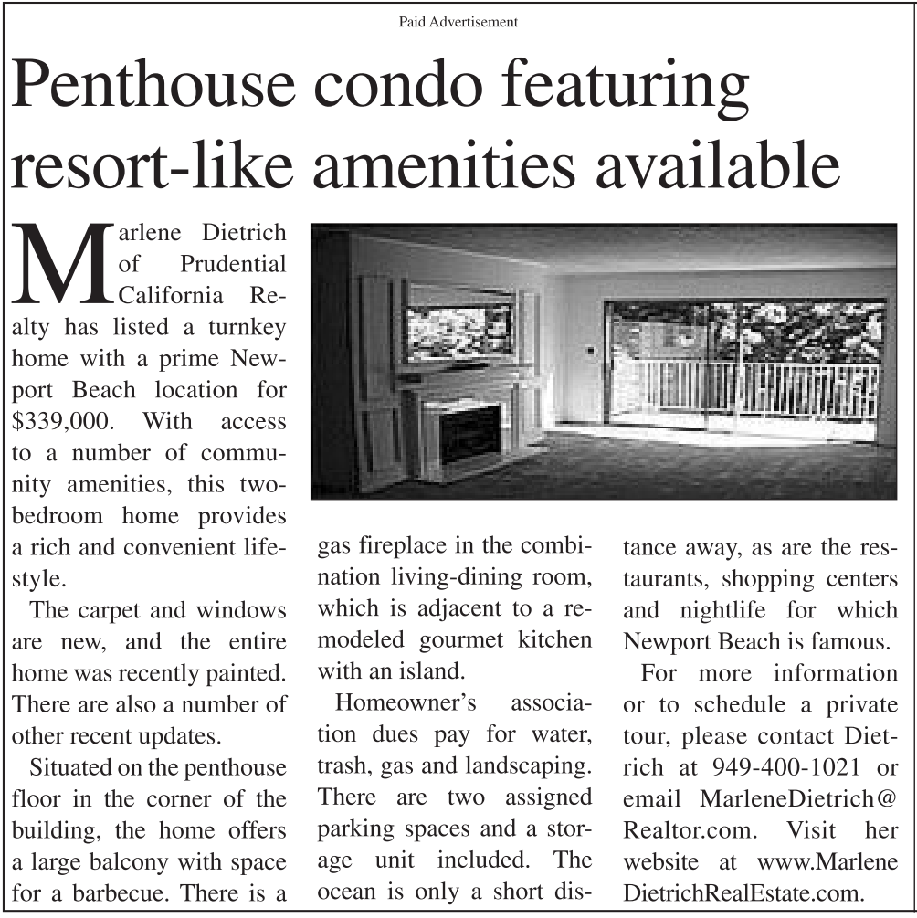 Paid Advertisement Penthouse condo featuring resort-like amenities available Marlene Dietrich of Prudential California Realty has listed a turnkey home with a prime Newport Beach location for $339,000. With access to a number of community amenities, this twobedroom home provides a rich and convenient lifestyle. The carpet and windows are new, and the entire home was recently painted. There are also a number of other recent updates. Situated on the penthouse floor in the corner of the building, the home offers a large balcony with space for a barbecue. There is a gas fireplace in the combination living-dining room, which is adjacent to a remodeled gourmet kitchen with an island. Homeowner’s association dues pay for water, trash, gas and landscaping. There are two assigned parking spaces and a storage unit included. The ocean is only a short dis tance away, as are the restaurants, shopping centers and nightlife for which Newport Beach is famous. For more information or to schedule a private tour, please contact Dietrich at 949-400-1021 or email MarleneDietrich@ Realtor.com. Visit her website at www.Marlene DietrichRealEstate.com. See also