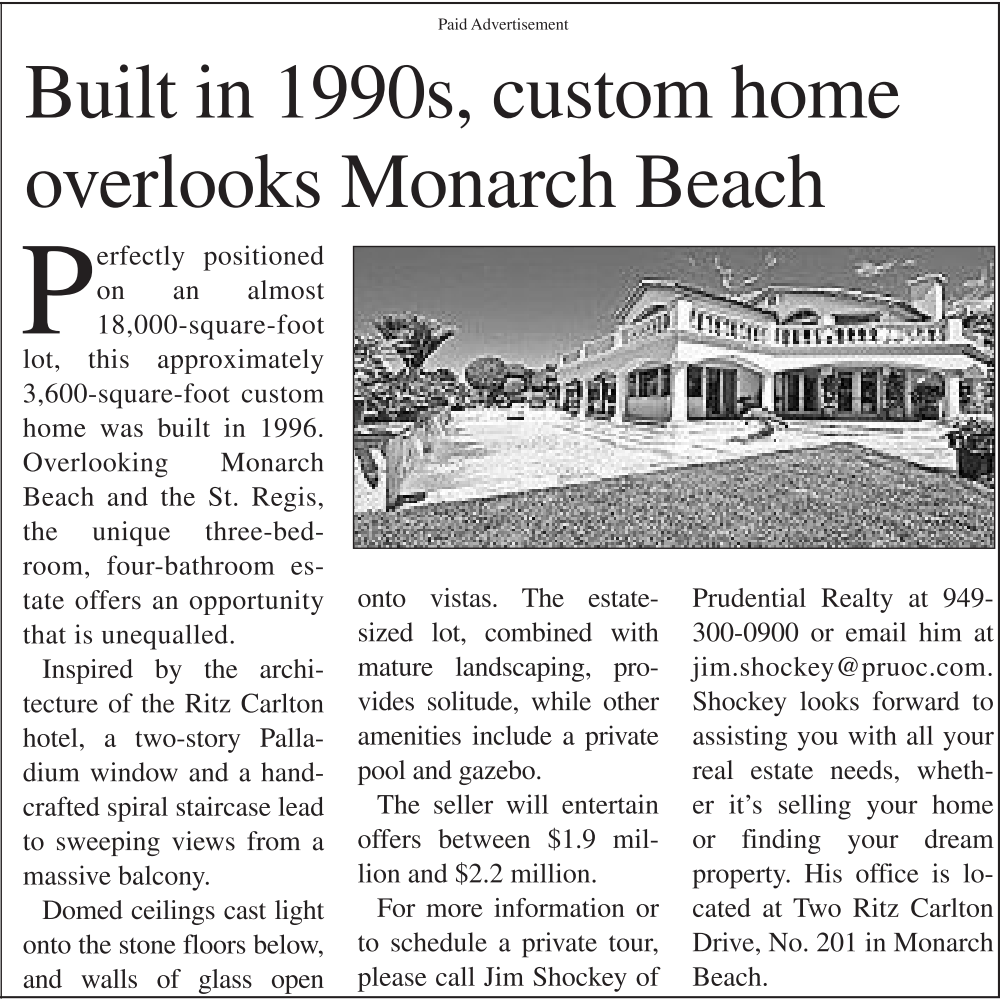 Prudential Realty at 949- 300-0900 or email him at jim.shockey@pruoc.com. Shockey looks forward to assisting you with all your real estate needs, whether it’s selling your home or finding your dream property. His office is located at Two Ritz Carlton Drive, No. 201 in Monarch Beach.