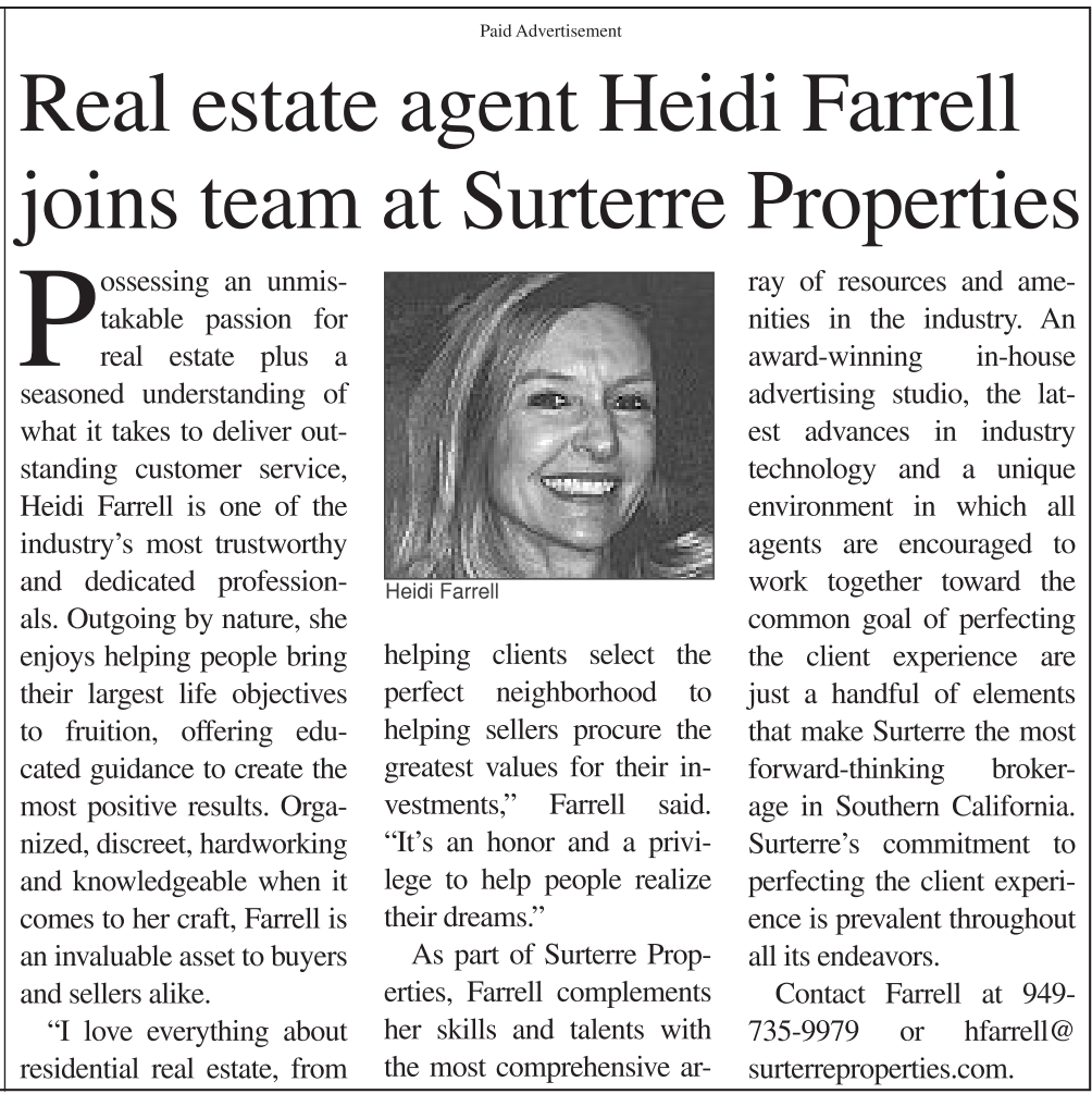 Possessing an unmistakable passion for real estate plus a seasoned understanding of what it takes to deliver outstanding customer service, Heidi Farrell is one of the industry’s most trustworthy and dedicated professionals. Outgoing by nature, she enjoys helping people bring their largest life objectives to fruition, offering educated guidance to create the most positive results. Organized, discreet, hardworking and knowledgeable when it comes to her craft, Farrell is an invaluable asset to buyers and sellers alike. “I love everything about residential real estate, from Paid Advertisement Real estate agent Heidi Farrell joins team at Surterre Properties Heidi Farrell helping clients select the perfect neighborhood to helping sellers procure the greatest values for their investments,” Farrell said. “It’s an honor and a privilege to help people realize their dreams.” As part of Surterre Properties, Farrell complements her skills and talents with the most comprehensive ar ray of resources and amenities in the industry. An award-winning in-house advertising studio, the latest advances in industry technology and a unique environment in which all agents are encouraged to work together toward the common goal of perfecting the client experience are just a handful of elements that make Surterre the most forward-thinking brokerage in Southern California. Surterre’s commitment to perfecting the client experience is prevalent throughout all its endeavors. Contact Farrell at 949- 735-9979 or hfarrell@ surterreproperties.com.