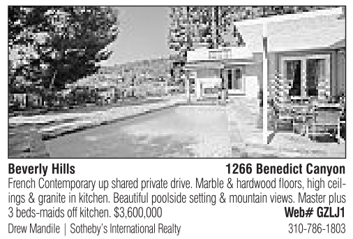 Beverly Hills 1266 Benedict Canyon Drew Mandile |Sotheby’s International Realty 310-786-1803 French Contemporary up shared private drive. Marble &hardwood floors, high ceilings &granite in kitchen. Beautiful poolside setting &mountain views. Master plus 3beds-maids off kitchen. $3,600,000 Web# GZLJ1 See also