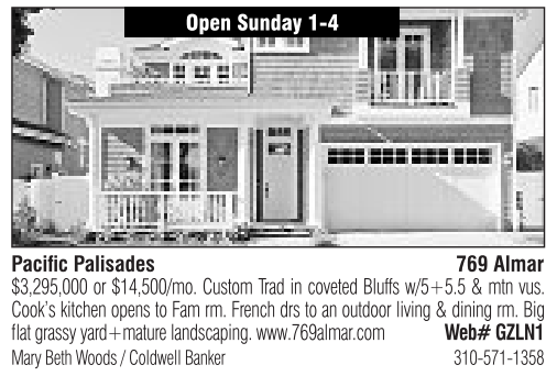 Pacific Palisades Open Sunday 1-4 769 Almar $3,295,000 or $14,500/mo. Custom Trad in coveted Bluffs w/5+5.5 &mtn vus. Cook’s kitchen opens to Fam rm. French drs to an outdoor living &dining rm. Big flat grassy yard+maturelandscaping. www.769almar.com Web# GZLN1 Mary Beth Woods /Coldwell Banker 310-571-1358 See also