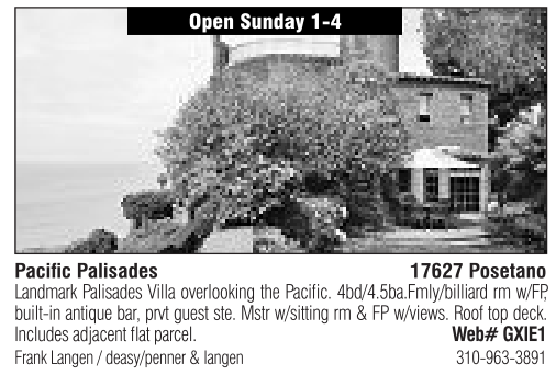 Landmark Palisades Villa overlooking the Pacific. 4bd/4.5ba.Fmly/billiard rmw/FP, built-in antique bar,prvt guest ste. Mstr w/sitting rm &FPw/views. Roof top deck. Includes adjacent flat parcel. Web# GXIE1