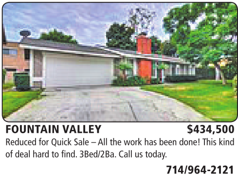 FOUNTAIN VALLEY $434,500 Reduced for Quick Sale –All the work has been done! This kind of deal hard to find. 3Bed/2Ba. Call us today.