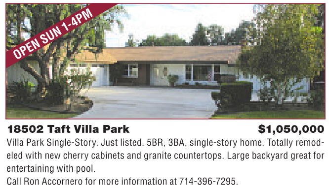 18502 Taft Villa Park $1,050,000 Villa Park Single-Story. Just listed. 5BR, 3BA, single-story home. Totally remodeled with new cherry cabinets and granite countertops. Large backyard great for entertaining with pool. Call Ron Accornero formoreinformation at 714-396-7295.