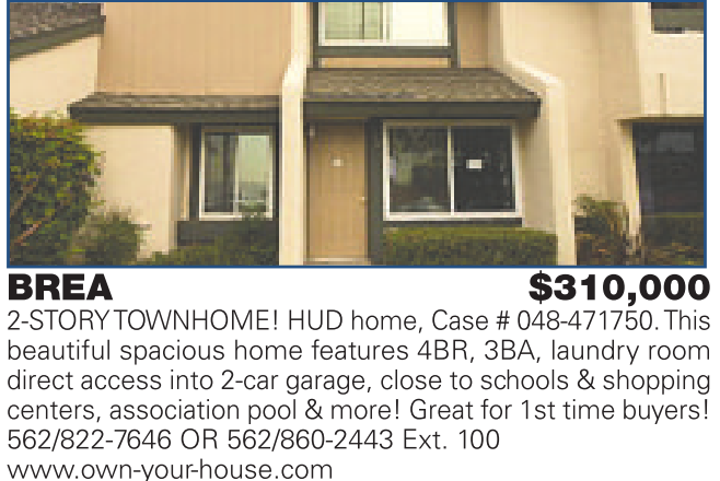 BREA $310,000 2-STORY TOWNHOME! HUD home, Case # 048-471750.This beautiful spacious home features 4BR, 3BA, laundry room direct access into 2-car garage, close to schools & shopping centers, association pool & more! Great for 1st time buyers! 562/822-7646 OR 562/860-2443 Ext. 100 www.own-your-house.com