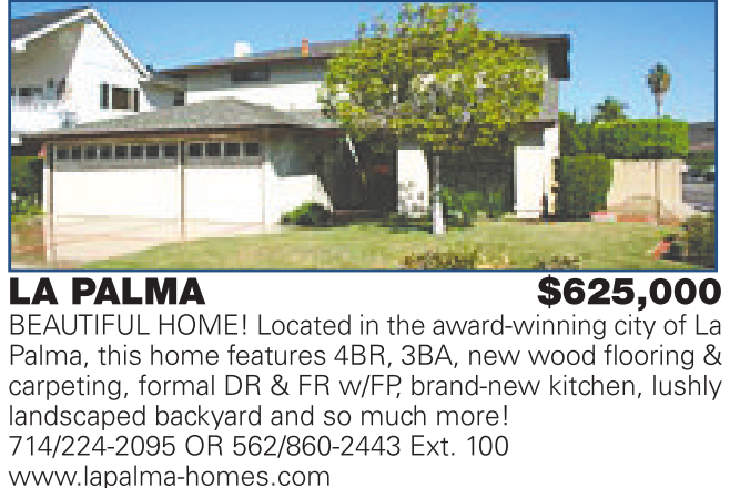 LA PALMA $625,000 BEAUTIFUL HOME! Located in the award-winning city of La Palma, this home features 4BR, 3BA, new wood flooring &carpeting, formal DR & FR w/FP, brand-new kitchen, lushly landscaped backyard and so much more! 714/224-2095 OR 562/860-2443 Ext. 100 www.lapalma-homes.com