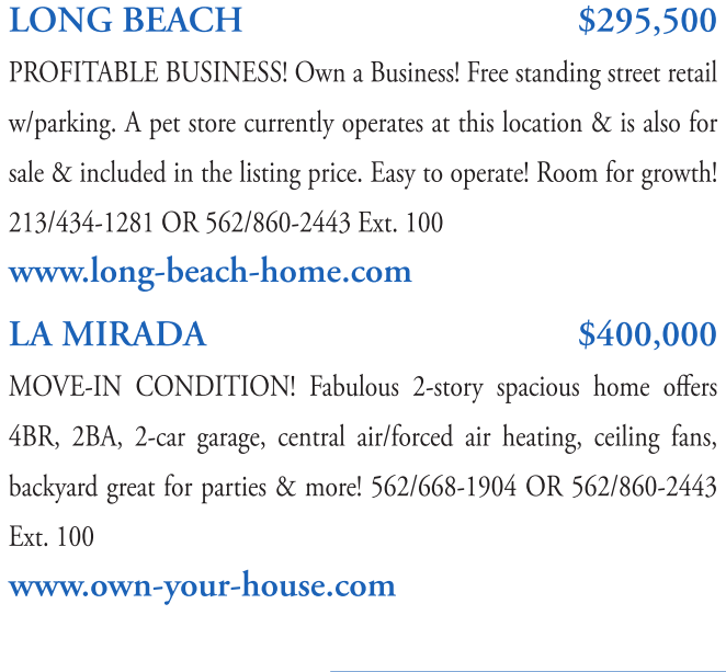 LONG BEACH $295,500 PROFITABLE BUSINESS! Own a Business! Free standing street retail w/parking. A pet store currently operates at this location & is also for sale & included in the listing price. Easy to operate! Room for growth! 213/434-1281 OR 562/860-2443 Ext. 100 www.long-beach-home.com LA MIRADA $400,000 MOVE-IN CONDITION! Fabulous 2-story spacious home offers 4BR, 2BA, 2-car garage, central air/forced air heating, ceiling fans, backyard great for parties & more! 562/668-1904 OR 562/860-2443 Ext. 100 www.own-your-house.com