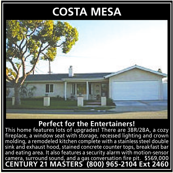 COSTA MESA Perfect for the Entertainers! This home features lots of upgrades! There are 3BR/2BA, a cozy fireplace, awindow seat with storage, recessed lighting and crown molding, aremodeledkitchen complete withastainless steeldouble sink and exhaust hood, stained concrete counter tops, breakfast bar and eating area. Italso features asecurity alarm with motion-sensor camera, surround sound, and agas conversation fire pit. $569,000 CENTURY 21 MASTERS (800) 965-2104 Ext 2460
