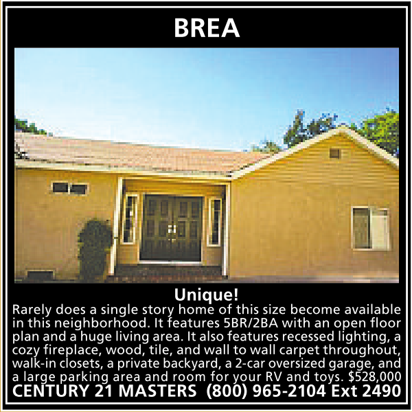 BREA Unique! Rarely does a single story home of this size become available in this neighborhood. Itfeatures 5BR/2BA with anopen floor plan andahuge living area.Italso features recessed lighting,a cozy fireplace,wood, tile,and wall to wall carpet throughout, walk-inclosets, aprivate backyard,a2-car oversizedgarage, and a large parking area and room for your RV and toys. $528,000 CENTURY 21 MASTERS (800) 965-2104 Ext 2490