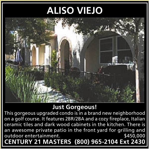 ALISO VIEJO Just Gorgeous! This gorgeous upgraded condo is in abrand newneighborhood on agolfcourse.Itfeatures2BR/2BA andacozyfireplace, Italian ceramic tiles and dark wood cabinets in the kitchen. There is an awesome private patio in the front yard for grilling and outdoor entertainment. $450,000 CENTURY 21 MASTERS (800) 965-2104 Ext 2430