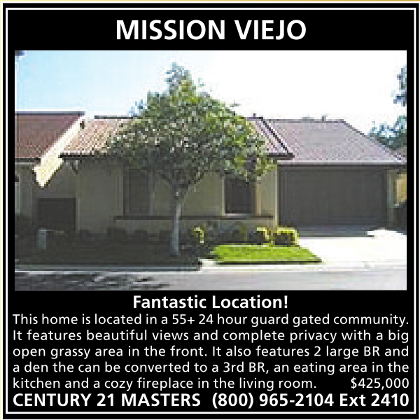 MISSION VIEJO Fantastic Location! This home is locatedina55+ 24 hourguardgated community. It features beautiful views and complete privacy with a big open grassy area in the front. It also features 2 large BR and aden the can be converted toa3rd BR, aneating area in the kitchen and acozy fireplace inthe living room. $425,000 CENTURY 21 MASTERS (800) 965-2104 Ext 2410 See also