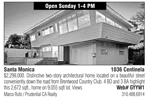 Santa Monica Open Sunday 1-4 PM 1036 Centinela Marco Rufo /Prudential CA Realty 310.488.6914 $2,299,000. Distinctive two-story architectural home located on abeautiful street conveniently down the road from Brentwood Country Club. 4BDand 3BAhighlight this 2,672 sqft., home on 9,055 sqft lot. Views Web# GYYW1