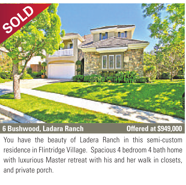 6Bushwood, Ladara Ranch Offered at $949,000 You have the beauty of Ladera Ranch in this semi-custom residence in Flintridge Village. Spacious 4bedroom 4bath home with luxurious Master retreat with his and her walk in closets, and private porch.
