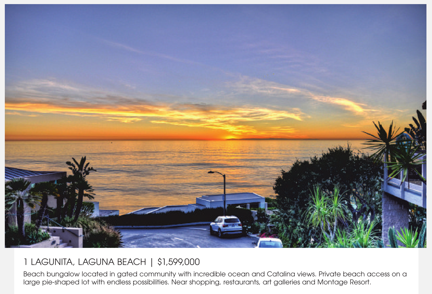 beach bungalow located in gated community with incredible ocean and catalina views. Private beach access on a large pie-shaped lot with endless possibilities. near shopping, restaurants, art galleries and Montage Resort.