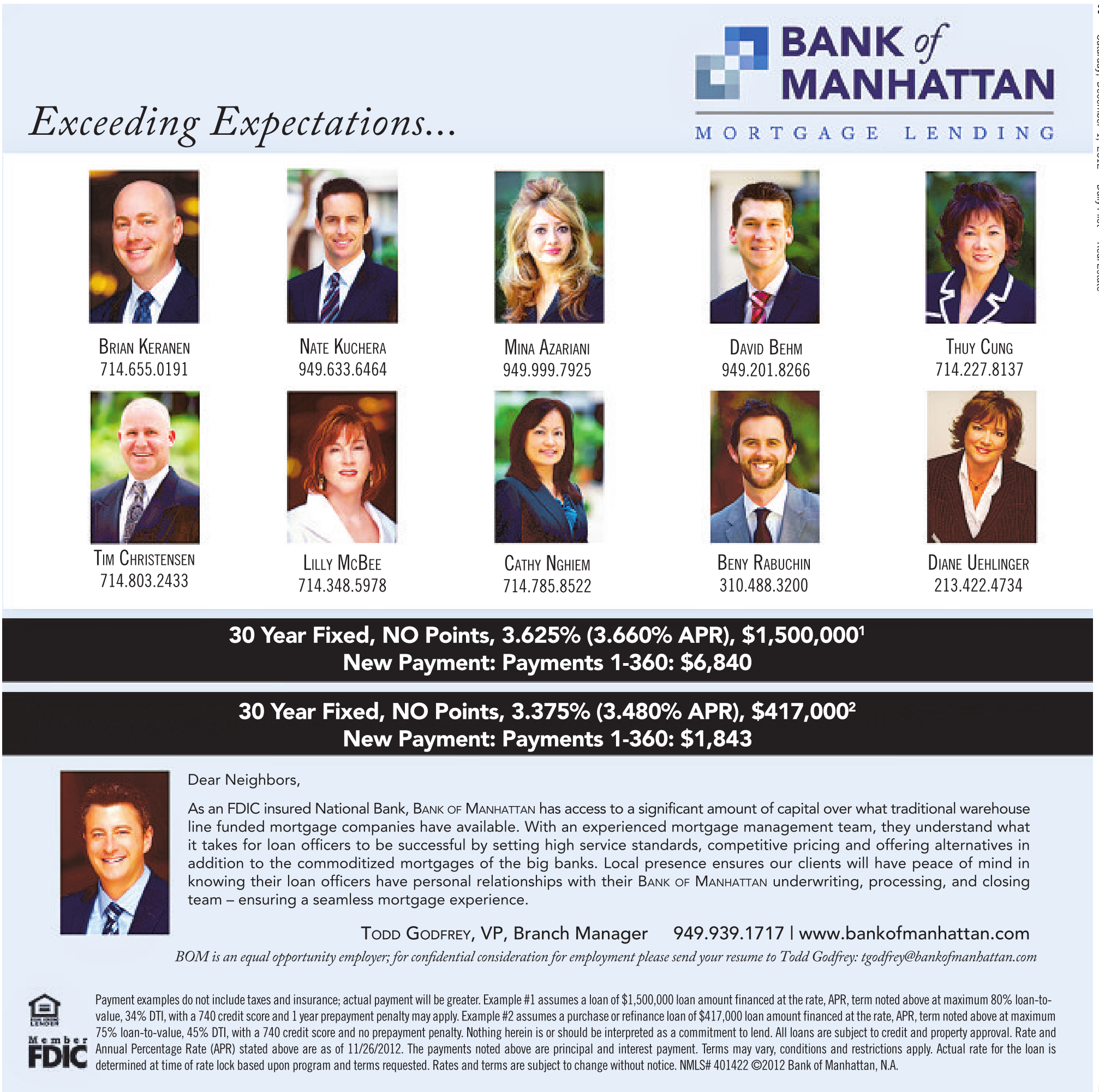 Payment examples do not include taxes and insurance; actual payment will be greater.Example #1 assumes aloan of $1,500,000 loan amount financed at the rate, APR, term noted above at maximum 80% loan-tovalue, 34% DTI, with a740 credit score and 1year prepayment penalty may apply.Example #2 assumes apurchase or refinance loan of $417,000 loan amount financed at the rate, APR, termnoted above at maximum 75% loan-to-value, 45% DTI, with a740 credit score and no prepayment penalty.Nothing herein is or should be interpreted as acommitment to lend. All loans are subject to credit and property approval. Rate and Annual Percentage Rate (APR) stated above are as of 11/26/2012. The payments noted above are principal and interest payment. Terms may vary, conditions and restrictions apply. Actual rate for the loan is determined at time of rate lock based upon program and terms requested. Rates and terms are subject to change without notice. NMLS# 401422 ©2012 Bank of Manhattan, N.A.