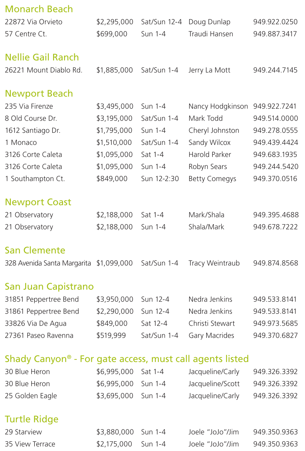 31851 Peppertree Bend $3,950,000 Sun 12-4 Nedra Jenkins 949.533.8141 31861 Peppertree Bend $2,290,000 Sun 12-4 Nedra Jenkins 949.533.8141 33826 Via De Agua $849,000 Sat 12-4 Christi Stewart 949.973.5685 27361 Paseo Ravenna $519,999 Sat/Sun 1-4 Gary Macrides 949.370.6827