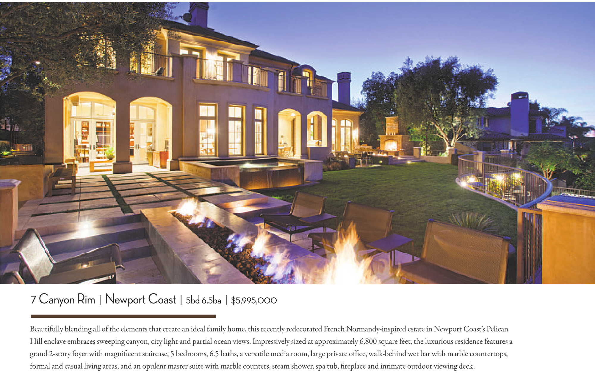 7 Canyon Rim | Newport Coast | 5bd 6.5ba | $5,995,000 Beautifullyblending allofthe elementsthatcreateanidealfamily home, this recently redecoratedFrench Normandy-inspiredestateinNewport Coast’s Pelican Hill enclave embraces sweeping canyon, citylight and partial ocean views. Impressively sizedatapproximately 6,800 squarefeet, theluxuriousresidence featuresa grand 2-storyfoyer withmagnificent staircase, 5bedrooms, 6.5 baths, aversatile mediaroom, largeprivate office, walk-behindwet bar withmarble countertops, formaland casual livingareas,and an opulent master suite with marble counters, steam shower, spatub, fireplace and intimate outdoor viewing deck.