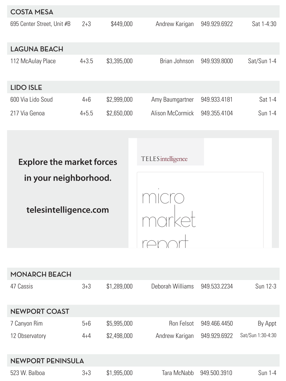 217 ViaGenoa 4+5.5 $2,650,000 Alison McCormick 949.355.4104 Sun 1-4