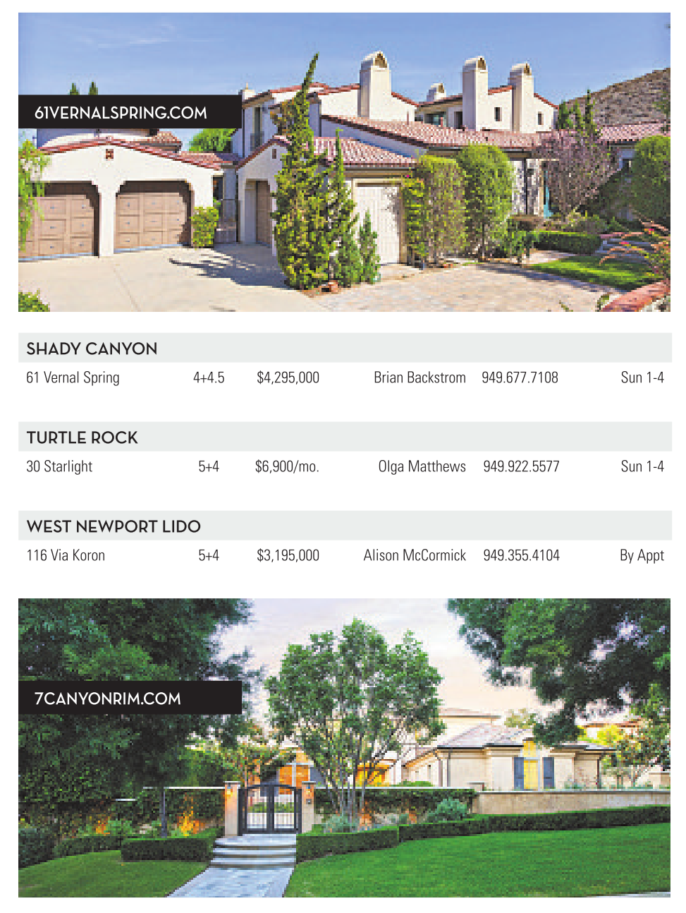 SHADYCANYON 61 Vernal Spring 4+4.5 $4,295,000 Brian Backstrom 949.677.7108 Sun 1-4
