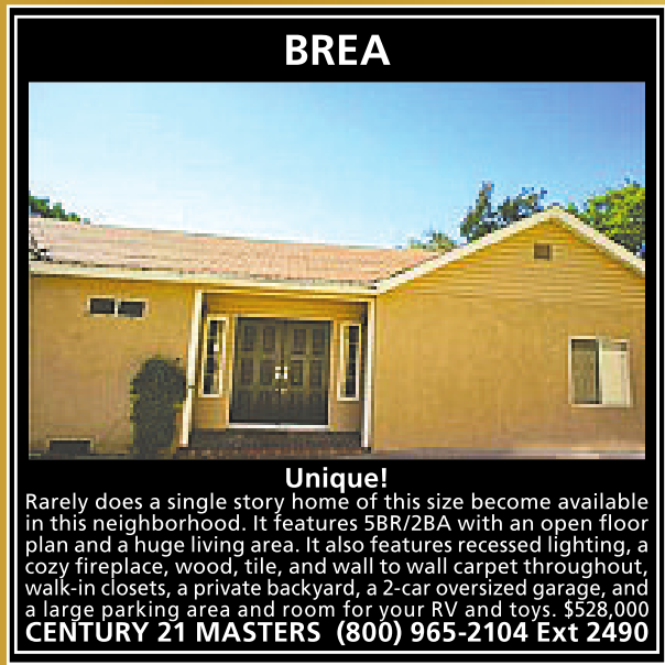 BREA Unique! Rarely does a single story home of this size become available in this neighborhood. Itfeatures 5BR/2BA with anopen floor plan andahuge living area.Italso features recessed lighting,a cozy fireplace,wood, tile,and wall to wall carpet throughout, walk-inclosets, aprivate backyard,a2-car oversizedgarage, and a large parking area and room for your RV and toys. $528,000 CENTURY 21 MASTERS (800) 965-2104 Ext 2490