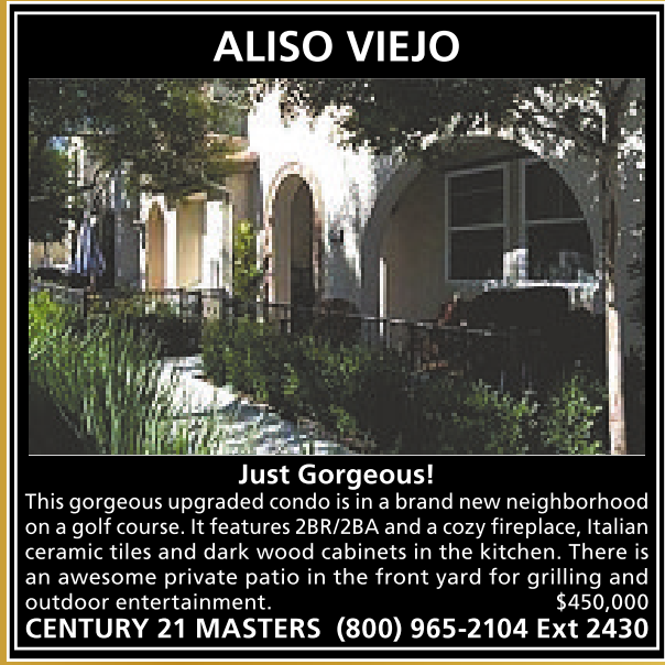 ALISO VIEJO Just Gorgeous! This gorgeous upgraded condo is in abrand newneighborhood on agolfcourse.Itfeatures2BR/2BA andacozyfireplace, Italian ceramic tiles and dark wood cabinets in the kitchen. There is an awesome private patio in the front yard for grilling and outdoor entertainment. $450,000 CENTURY 21 MASTERS (800) 965-2104 Ext 2430