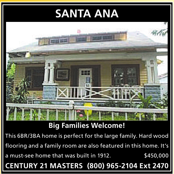 This 6BR/3BA home isperfect for the large family. Hard wood flooring and afamily room are also featured in this home. It’s amust-see home that was built in1912. $450,000 CENTURY 21 MASTERS (800) 965-2104 Ext 2470