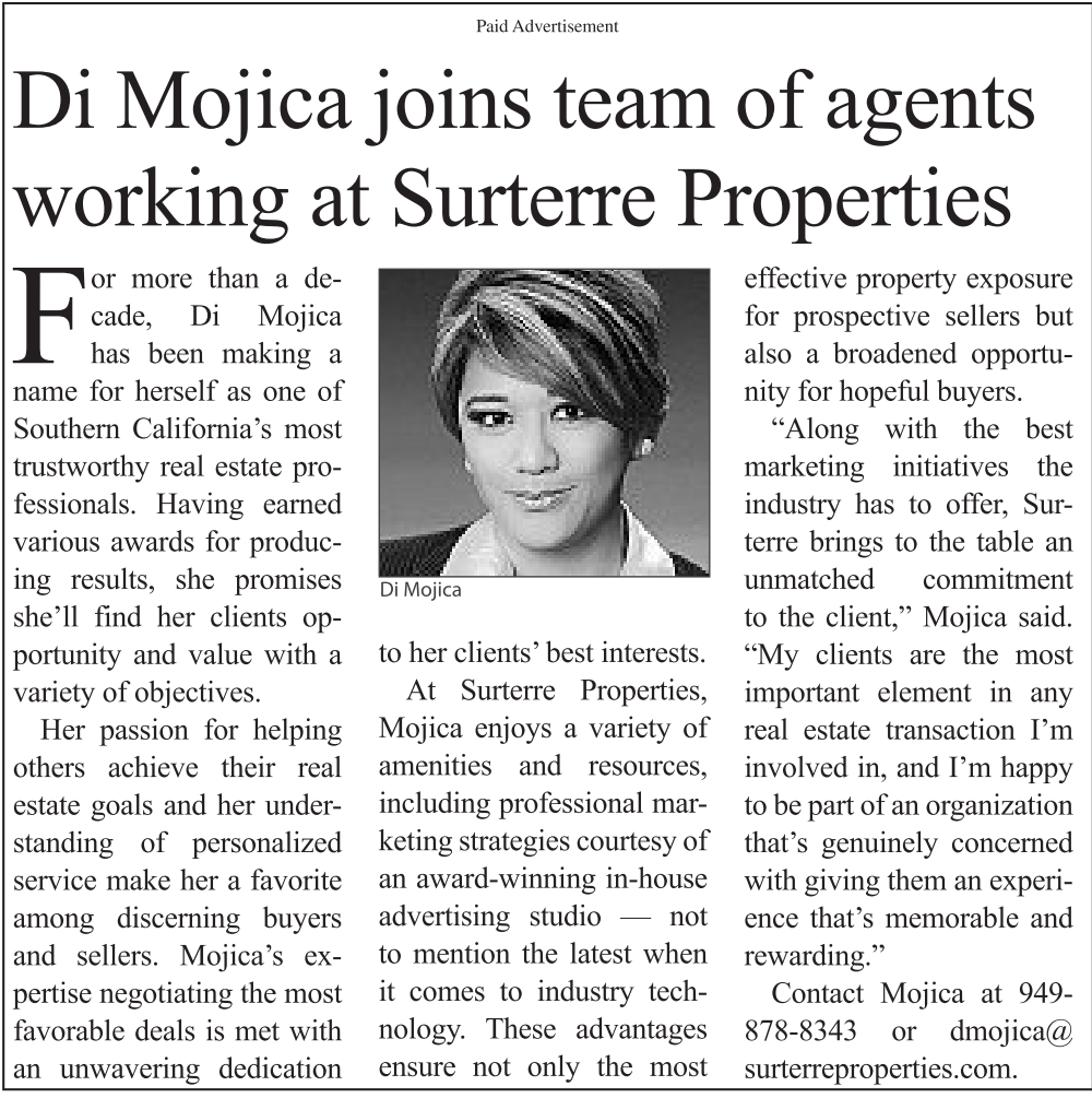 more than a decade, Di Mojica has been making a name for herself as one of Southern California’s most trustworthy real estate professionals. Having earned various awards for producing results, she promises she’ll find her clients opportunity and value with a variety of objectives.