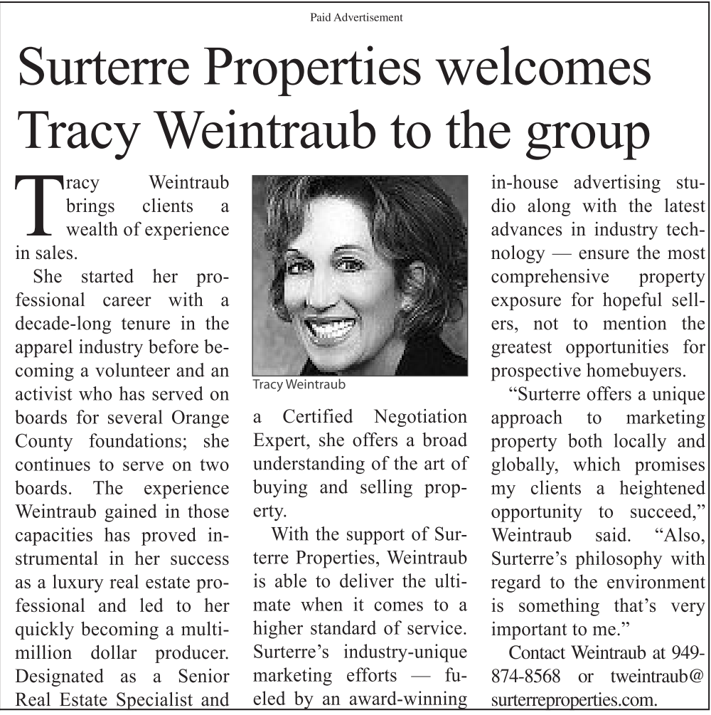 Tracy Weintraub brings clients a wealth of experience in sales. She started her professional career with a decade-long tenure in the apparel industry before becoming a volunteer and an activist who has served on boards for several Orange County foundations; she continues to serve on two boards. The experience Weintraub gained in those capacities has proved instrumental in her success as a luxury real estate professional and led to her quickly becoming a multimillion dollar producer. Designated as a Senior Real Estate Specialist and Paid Advertisement Surterre Properties welcomes Tracy Weintraub to the group TracyWeintraub a Certified Negotiation Expert, she offers a broad understanding of the art of buying and selling property. With the support of Surterre Properties, Weintraub is able to deliver the ultimate when it comes to a higher standard of service. Surterre’s industry-unique marketing efforts — fueled by an award-winning in-house advertising studio along with the latest advances in industry technology — ensure the most comprehensive property exposure for hopeful sellers, not to mention the greatest opportunities for prospective homebuyers. “Surterre offers a unique approach to marketing property both locally and globally, which promises my clients a heightened opportunity to succeed,” Weintraub said. “Also, Surterre’s philosophy with regard to the environment is something that’s very important to me.” Contact Weintraub at 949- 874-8568 or tweintraub@ surterreproperties.com.
