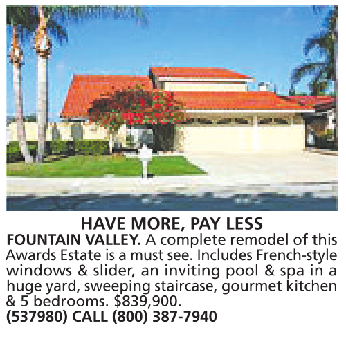 HAVE MORE, PAY LESS FOUNTAIN VALLEY. Acomplete remodel of this Awards Estate is amust see. Includes French-style windows & slider, an inviting pool & spa in a
