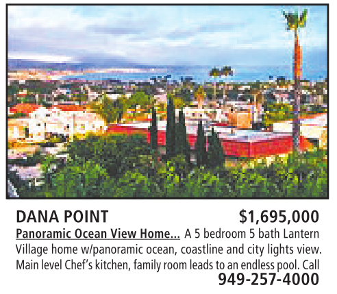 DANA POINT $1,695,000 Panoramic Ocean View Home... A5bedroom 5bath Lantern Village home w/panoramic ocean, coastline and city lights view. Main level Chef’s kitchen,familyroomleads to an endlesspool. Call 949-257-4000