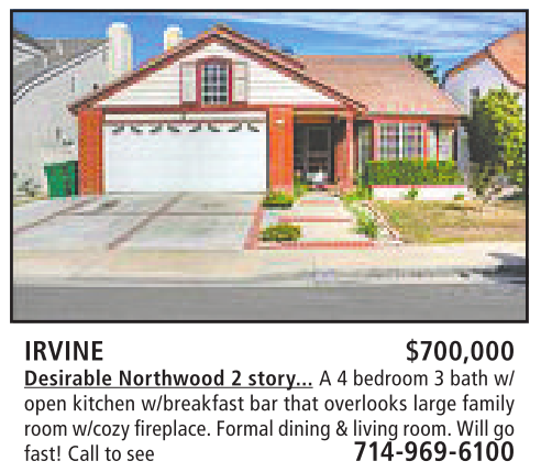 IRVINE $700,000 Desirable Northwood 2 story... A4bedroom 3bath w/ open kitchen w/breakfast bar that overlooks large family room w/cozy fireplace.Formal dining&living room. Will go fast! Call to see 714-969-6100