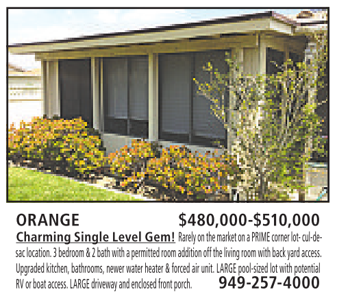 ORANGE $480,000-$510,000 Charming Single LevelGem! Rarely on themarketonaPRIME corner lot- cul-de- saclocation. 3bedroom&2bathwithapermittedroomadditionoff theliving room with back yard access. Upgraded kitchen, bathrooms, newer water heater &forced air unit. LARGE pool-sized lot with potential RV or boat access.LARGE driveway andenclosed frontporch. 949-257-4000